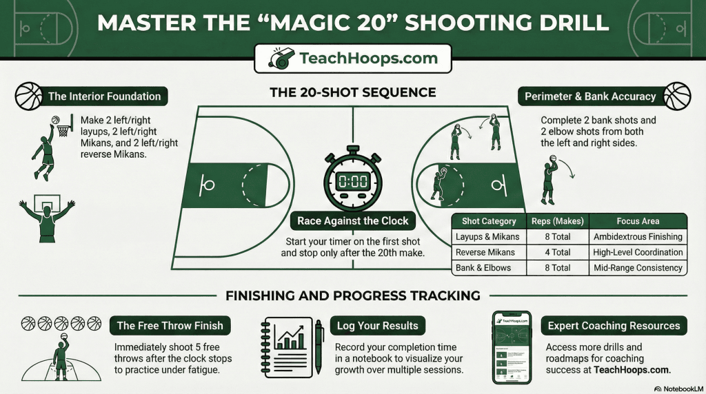 Are you looking for a structured way to improve your finishing and shooting consistency? Whether you are a player looking to level up your game or a coach searching for effective practice plans, the Magic 20 drill is a high-repetition, timed shooting drill designed to sharpen your skills under pressure. This drill focuses on essential shots, from layups to elbow jumpers, requiring you to make every shot before you finish the clock.